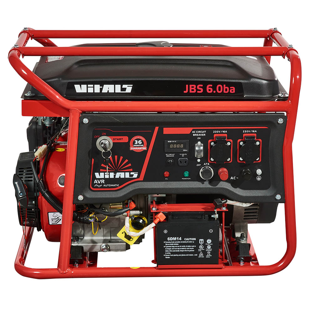 Бензиновий генератор Vitals JBS 6.0ba — це компактний переносний електричний агрегат, призначений для резервного або аварійного живлення побутових споживачів. Виробляє однофазний змінний струм напругою 230 В, частотою 50 Гц. Запуск генератора можливий у ручному або автоматичному режимі.