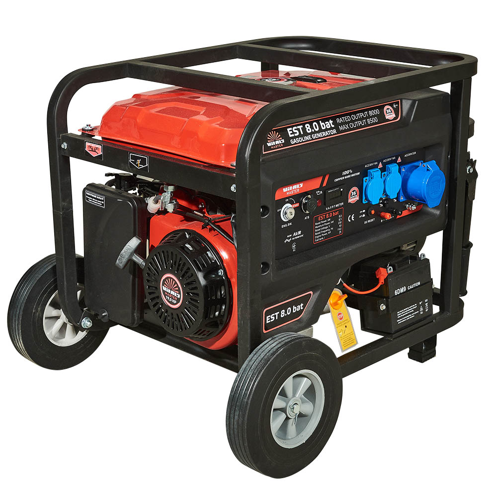 Бензиновий генератор Master EST 8.0 bat — це компактний переносний електричний агрегат, призначений для резервного або аварійного живлення побутових споживачів. Виробляє однофазний змінний струм 230 В, частотою 50 Гц. Запуск генератора можливий у ручному або автоматичному режимі.