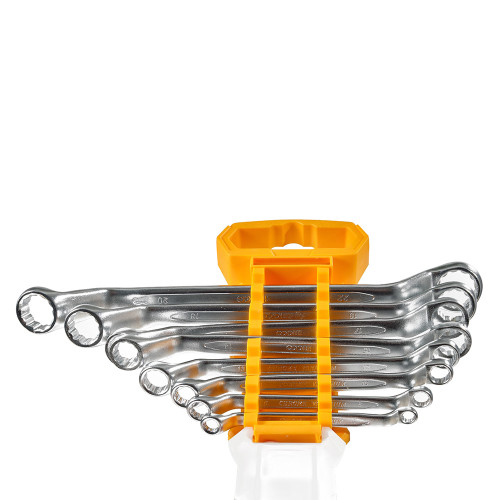 У наборі — 8 двосторонніх ключів з наступними розмірами: 6×7, 8×9, 10×11, 12×13, 14×15, 16×17, 18×19, 20×22 мм. Вироби зручно зберігаються на полімерній картці, що полегшує транспортування й організацію робочого простору.