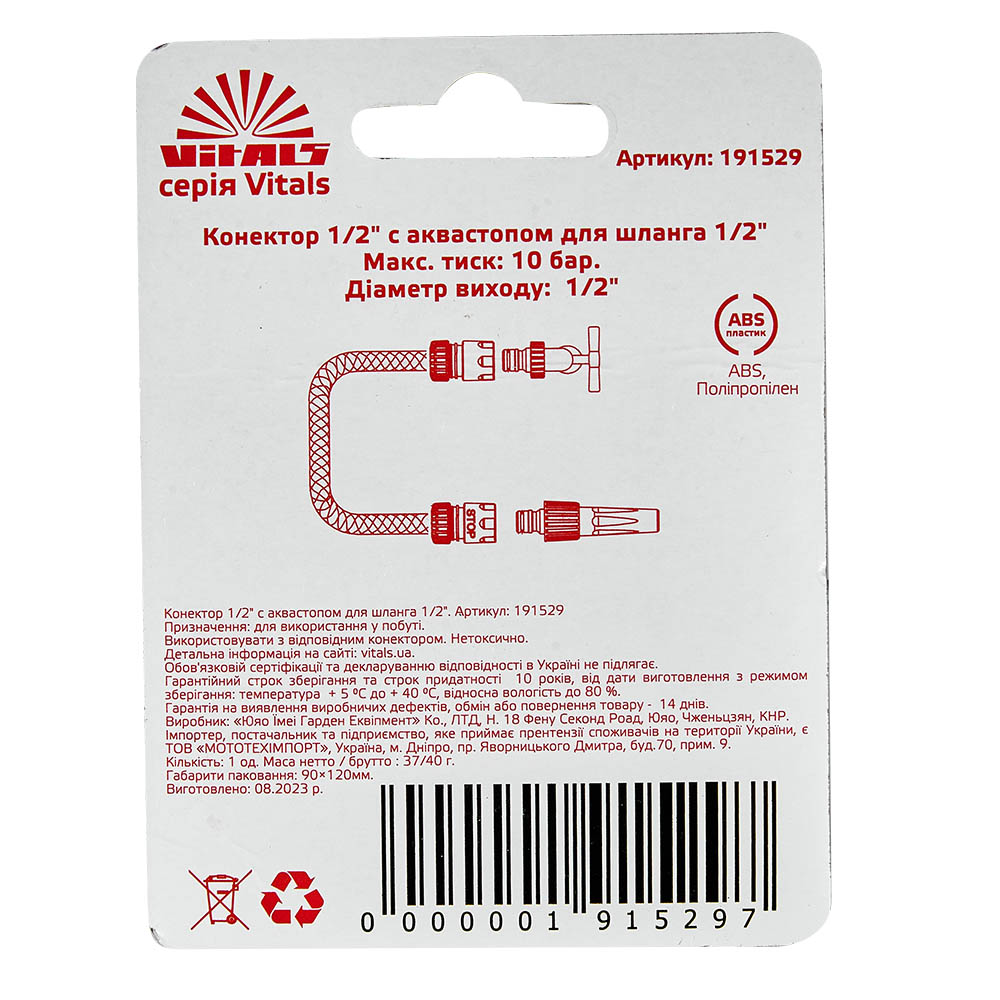 Характеристики на Конектор 1/2" з аквастопом для шланга 1/2" Vitals