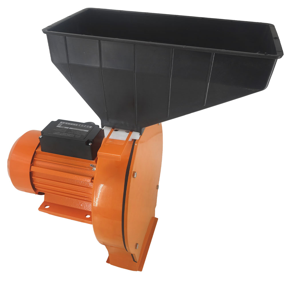 Модель працює від стандартної мережі 220 В та обладнана міцним пластиковим завантажувальним бункером об’ємом 6 літрів, який забезпечує зручність під час завантаження сировини. Тип подрібнення — молотковий, що гарантує рівномірне подрібнення зерна без втрати корисних властивостей корму.