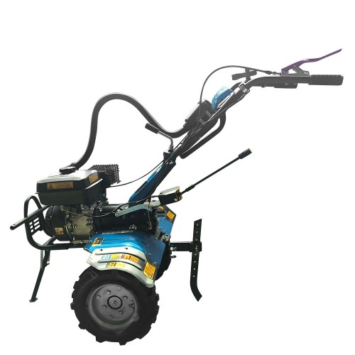 Конструкція передбачає повністю металеву коробку передач із розбірною задньою кришкою, що спрощує обслуговування. Система повітряного охолодження забезпечує стабільну роботу навіть при високих навантаженнях. У комплекті – 6-секційна почвофреза з максимальною шириною захвату 840 мм, що дозволяє ефективно обробляти невеликі ділянки. Транспортні колеса 4.00-8 оснащені обгінними розблокіраторами, які значно полегшують маневрування та розвороти.