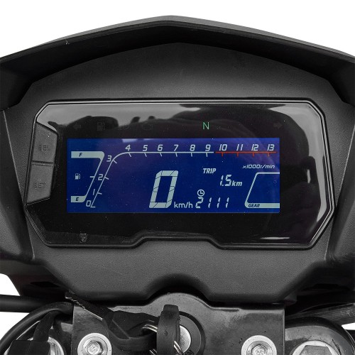 • Приборна панель: Електронна панель з тахометром, спідометром, індикацією передачі, покажчиком дальнього світла та індикатором поворотів, що забезпечує зручний моніторинг стану мотоцикла під час руху.