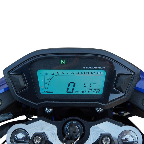 • Сучасна електронна панель приладів з показами швидкості, обертів, пробігу, часу, заряду АКБ і рівня пального.