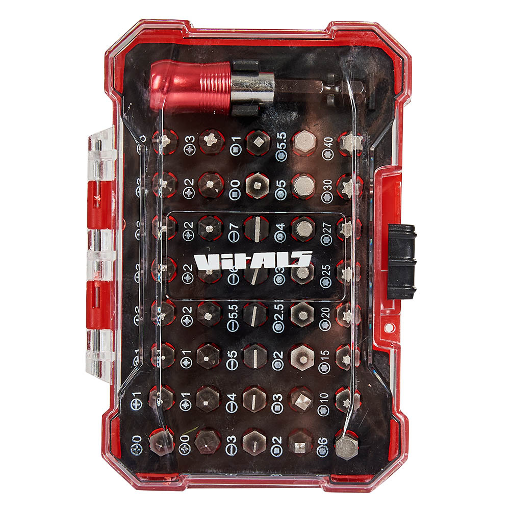 Набір біт з тримачем 41 предмет Vitals призначений для монтажу та демонтажу різьбових з'єднань з різними типами шліців. Довжина насадок складає 25 мм. Використовується як в ручному інструменті, так і з шурупокрутами, завдяки універсальному шестигранному хвостовику 1/4″. Насадки виготовлені з високоміцної сталі CR-V, яка відрізняється довговічністю та не схильна до руйнування. Тримач для біт виготовлений з нержавійної сталі, хвостовик із Cr-V сталі. У тримачі встановлено потужний магніт, який надійно фіксує навіть довгі біти та полегшує вкручування гвинтів. Крім магніту реалізований фіксатор, який унеможливлює випадіння біт при роботі. Насадки легко встановлюються в тримач одним натисканням, а відтягнувши назад втулку, їх легко звільнити. Такий пристрій дозволяє швидко змінювати біти та надійно їх утримувати. Усі насадки розміщені у зручному кейсі із замком. Біти та тримач мають свої окремі осередки, завдяки чому не випадають та не губляться під час транспортування.