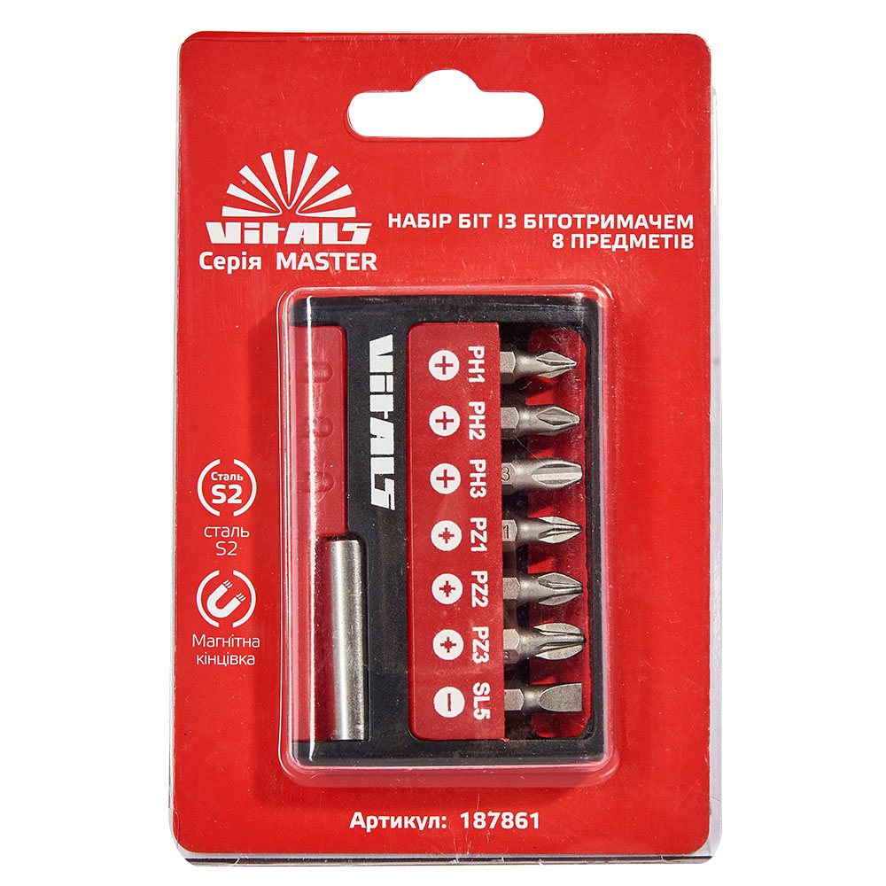 Набір біт з тримачем 32 предметів Vitals Master призначений для монтажу та демонтажу різьбових з'єднань з різними типами шліців. Довжина насадок складає 25 мм. Використовується як в ручному інструменті, так і з шурупокрутами, завдяки універсальному шестигранному хвостовику 1/4". Є кольорове маркування біт для їх швидкого вибору. Насадки виготовлені з високоміцної сталі S2, яка відрізняється довговічністю та не схильна до руйнування. У складі цієї сталі є молібден і кремній, які надають виробу високий опір до навантажень та низький поріг оборотної деформації. Твердість сталі — 58-62 HRC. Тримач для біт виготовлений з нержавійної сталі, хвостовик із Cr-V сталі. У тримачі встановлено потужний магніт, який надійно фіксує навіть довгі біти та полегшує вкручування гвинтів. Крім магніту реалізований фіксатор, який унеможливлює випадіння біт при роботі. Насадки легко встановлюються в тримач одним натисканням, а відтягнувши назад втулку, їх легко звільнити. Такий пристрій дозволяє швидко змінювати біти та надійно їх утримувати. Усі насадки розміщені у зручному кейсі із замком. Біти та тримач мають свої окремі осередки, завдяки чому не випадають та не губляться під час транспортування.