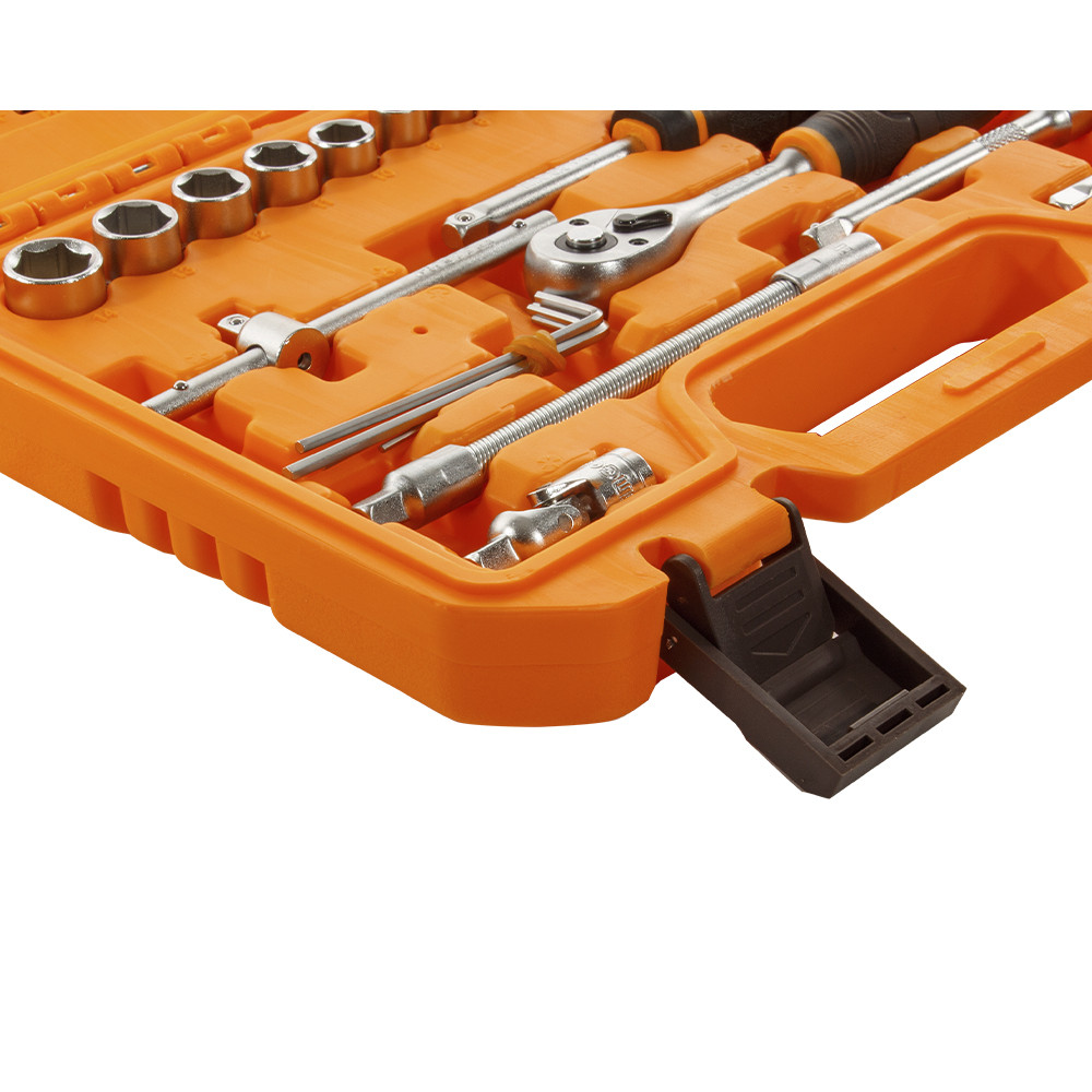 Матеріал кейсу — ударостійкий пластик із металевими замками, який надійно захищає інструменти та забезпечує зручність зберігання й транспортування.