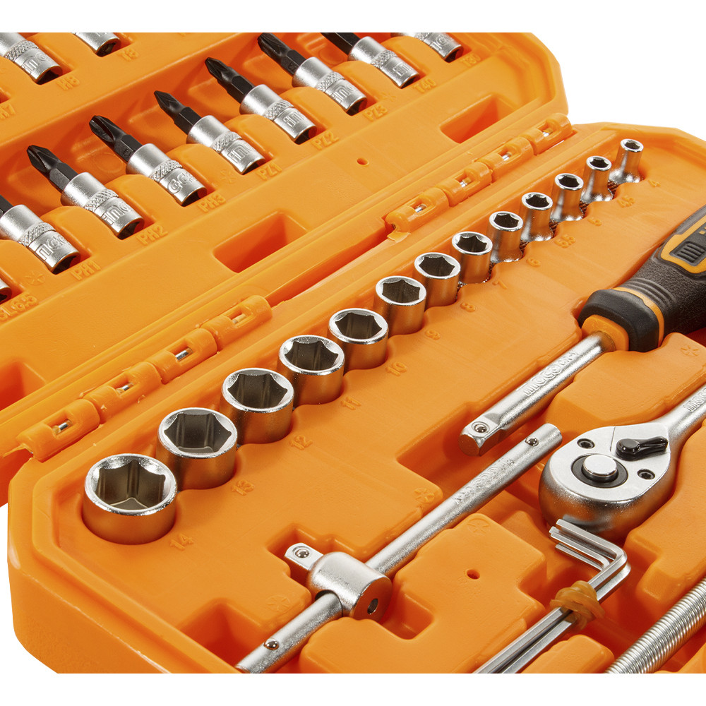 У комплект входять торцеві шестигранні головки 1/4" розміром від 4 до 14 мм: 4; 4,5; 5; 5,5; 6; 7; 8; 9; 10; 11; 12; 13; 14 мм. Біти виготовлені зі сталі Cr-V 6150, мають різні типи (TORX, HEX, PH, PZ, SL) для роботи з широким спектром кріплень.