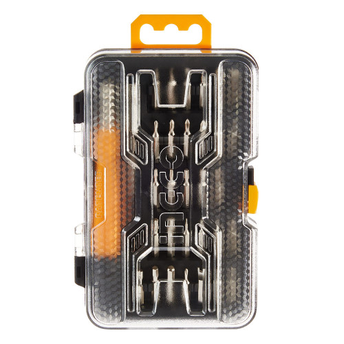 У набір входить 30 біт 4х28 мм розмірів: SL1.5, SL2, SL2.5, SL3, SL3.5, SL4, PH000, PH00, PH0, PH1, T4, T5, T6, T7, T8, T9, T10, T15, T20, H0.9, H1.3, H1.5, H2, H2.5, H3, H4, Y2, U2.6, а також п'ятикутна зірка 0.8 і 1.2, шліц яких підходить для iPhone та iPad.