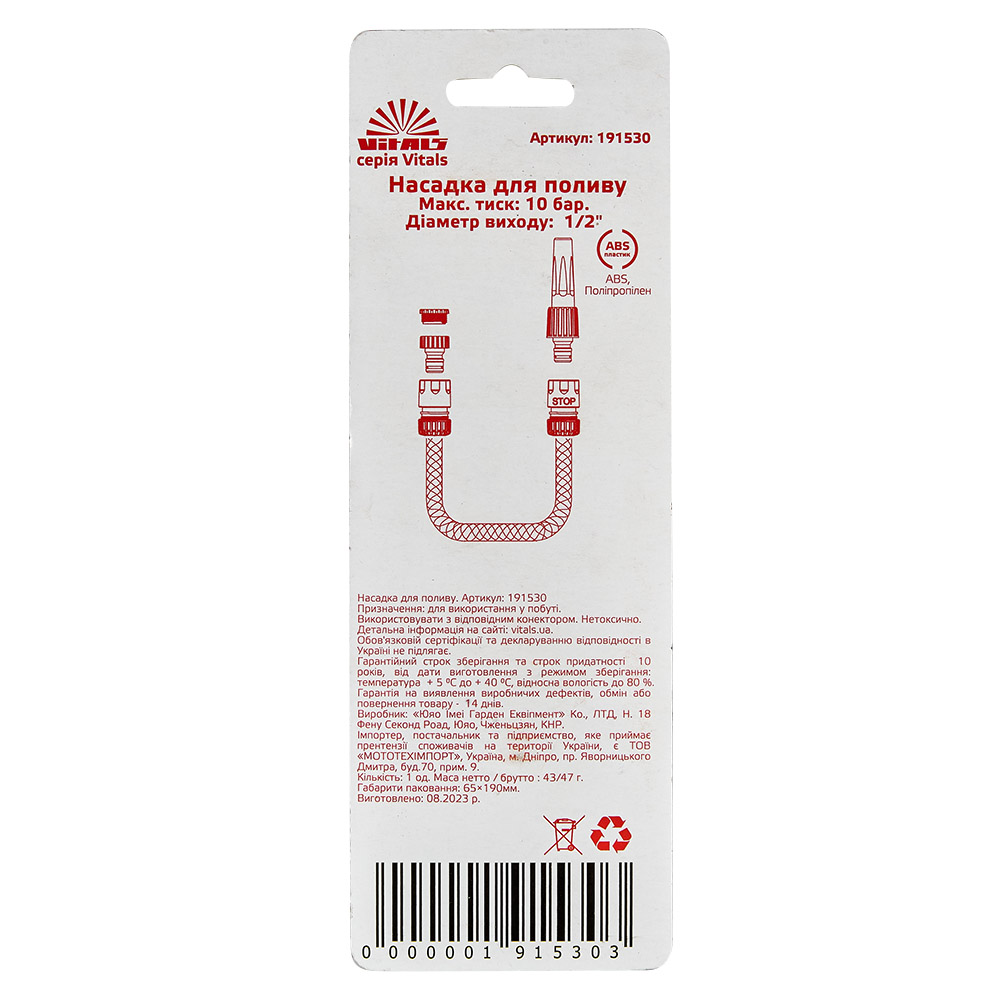 Загалом, насадка для поливу з плавним регулюванням потоку води для конектора 1/2" Vitals - це надійний, ефективний і легко налаштовуваний інструмент для вашої зрошувальної системи.