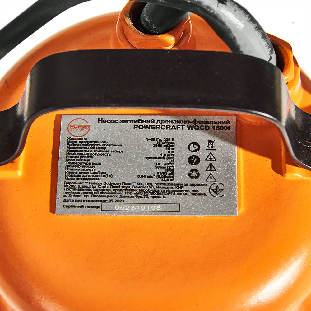Powercraft WQCD 1800f — занурювальний дренажно-фекальний насос, призначений для відкачування забрудненої води з великими твердими частинками та осадом. Оснащений подрібнювальним механізмом, що дозволяє справлятися з водою, яка містить частинки до 25 мм. Насос має достатню вагу (14,5 кг) для стійкості у воді та водночас є мобільним для встановлення і переміщення. Клас захисту IP68 забезпечує безпечну роботу при повному зануренні у воду.