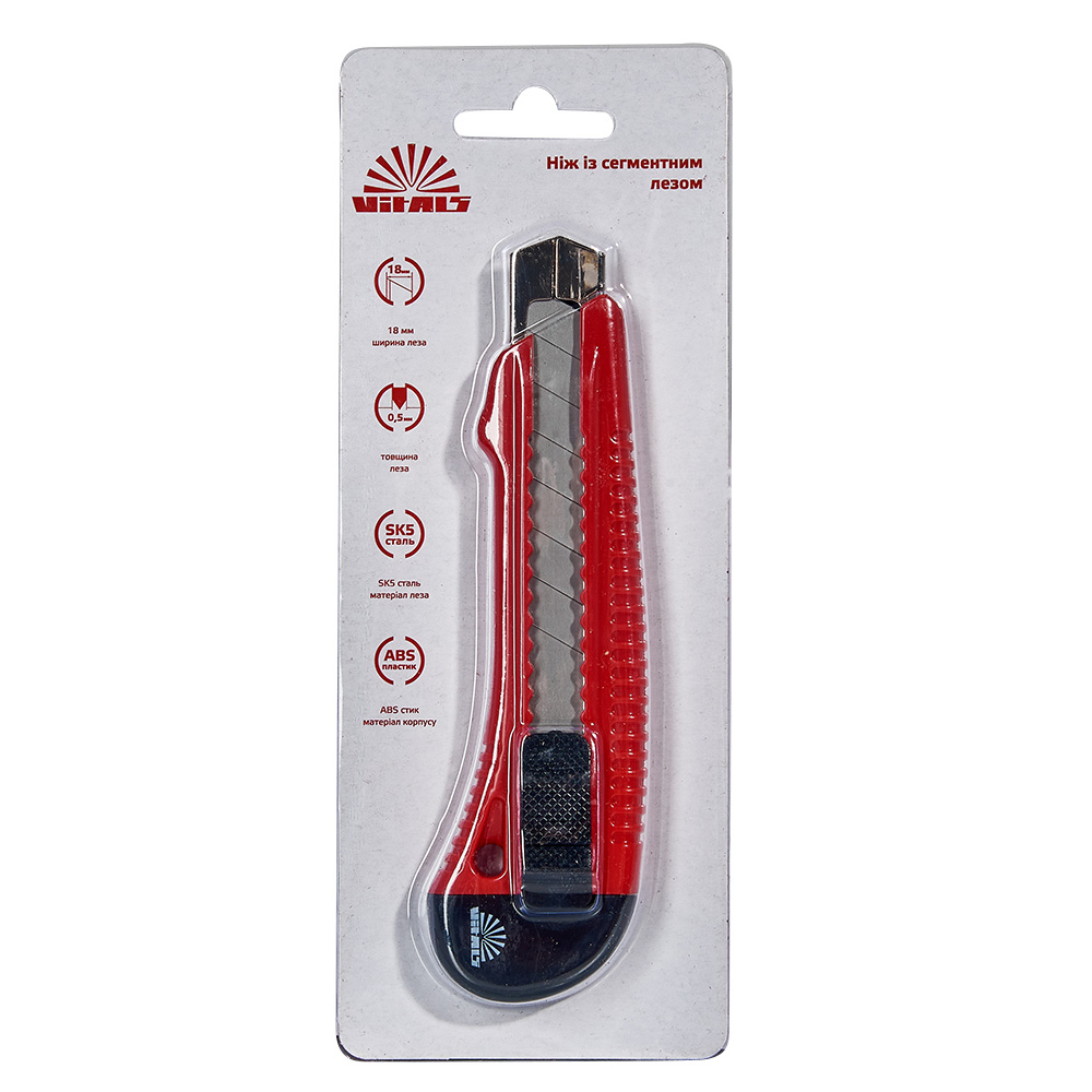 Ніж сегментний 18 мм пластиковий з металевою напрямною Vitals застосовується на будівництві та складах, а також у домашній та офісній роботі. Цей інструмент без зусиль справляється з монтажною піною, шпалерами, скотчем, плівкою, папером та іншими матеріалами.