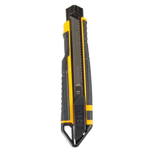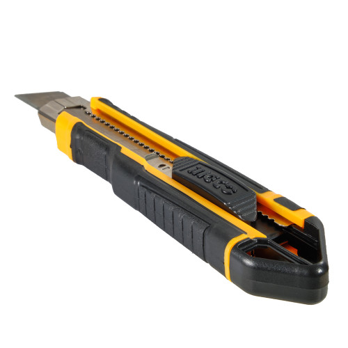 Корпус виготовлений із міцного матеріалу, а металеві напрямні значно підвищують його надійність і довговічність. Спеціальна кнопка-фіксатор запобігає довільному висуненню леза, забезпечуючи безпечну експлуатацію. Антиковзка накладка на руків’ї сприяє зручному хвату та запобігає вислизанню ножа під час роботи.