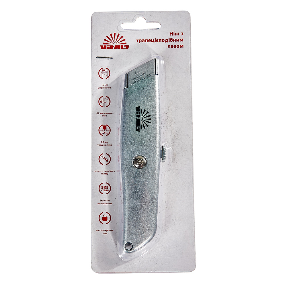 Ніж трапеція Vitals – це універсальний ніж для різання таких матеріалів як лінолеум, килимові покриття, гіпсолітові плити, гіпсокартон, покрівельні матеріали, пластик, дерево.