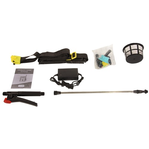 Обприскувач у зборі з акумулятором, насосом та шлангом; Телескопічна штанга; Кран; Комплект розпилювальних насадок| Комплект ущільнювальних прокладок; Ранцевий ремінь| Зарядний пристрій| Керівництво з експлуатації ; Упаковка.