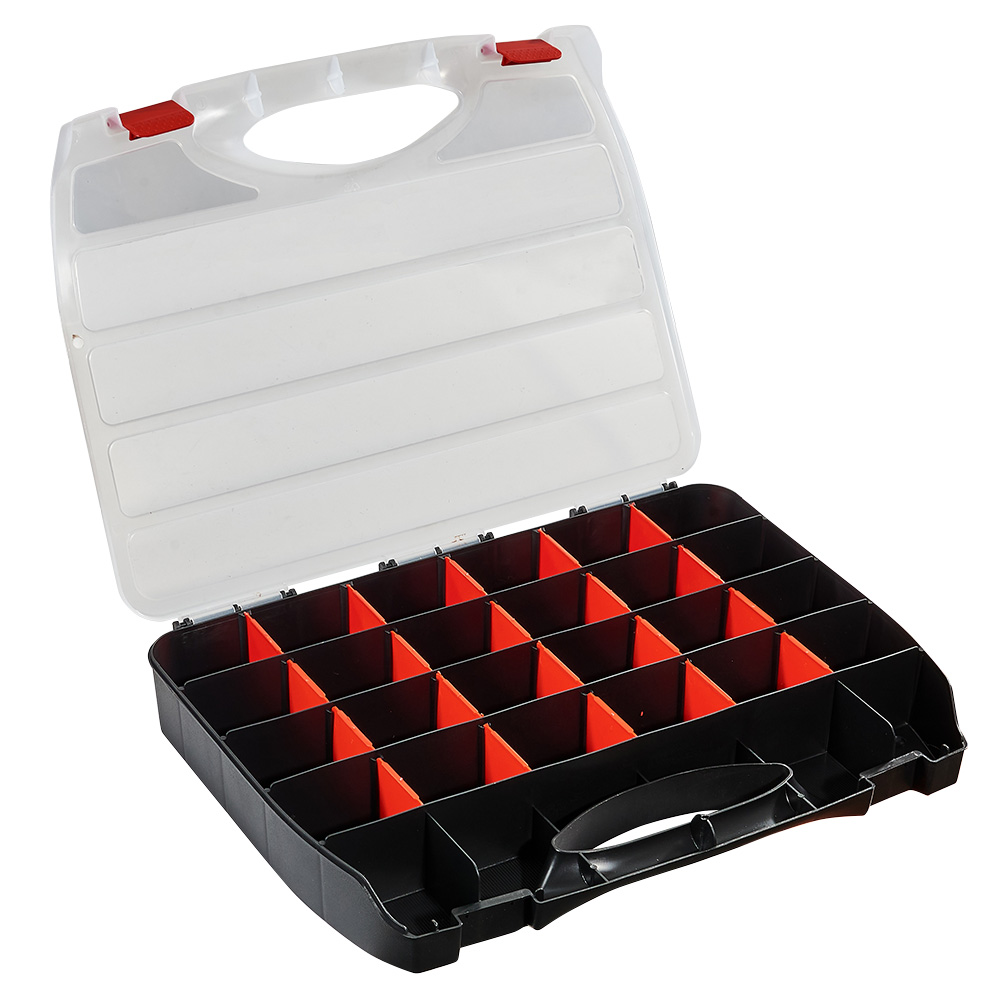 Завдяки грамотному поділу на секції, цей органайзер дозволяє системно організувати зберігання наборів інструментів та дрібних деталей. За допомогою 20 регульованих перегородок ви можете легко змінювати розмір відсіків відповідно до вашого набору інструментів або аксесуарів.