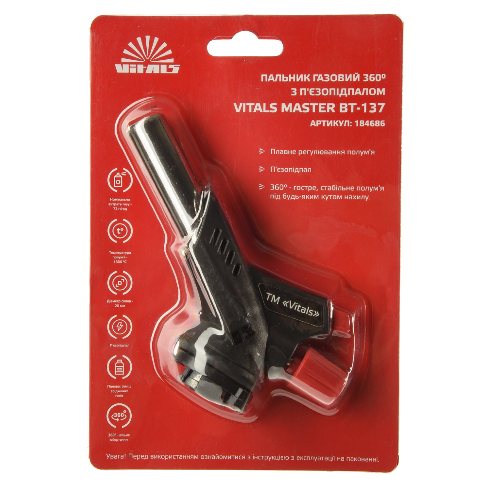 Пальник газовий 360° з п'єзопідпалом Ø20 мм Vitals Master BT-137 призначений для розпалювання багать та мангалів, хобі та моделювання, паяння з'єднань труб, видалення фарби, розігріву замерзлих водопровідних труб.