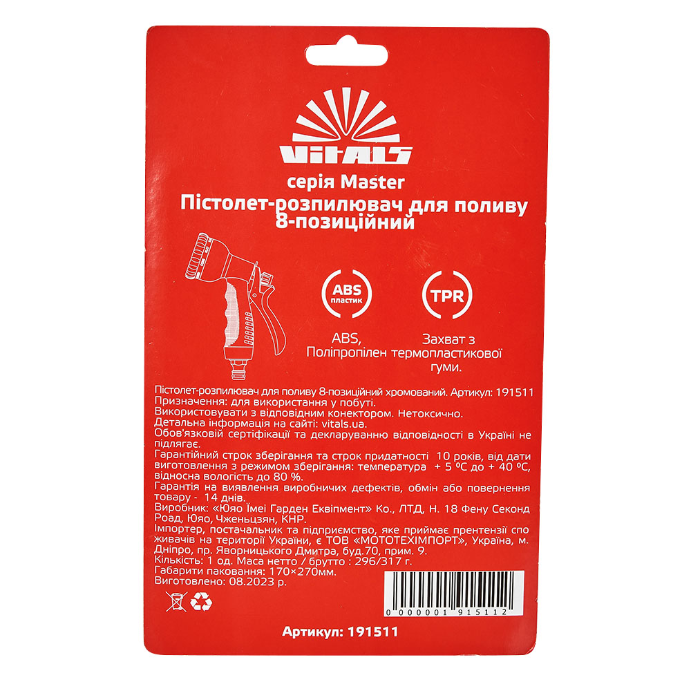 Пістолет-розпилювач восьмипозиційний металевий хромований Vitals Master - це надійний і зручний інструмент для поливу рослин, який дозволяє налаштовувати напрямок і ширину струменя в залежності від ваших потреб.