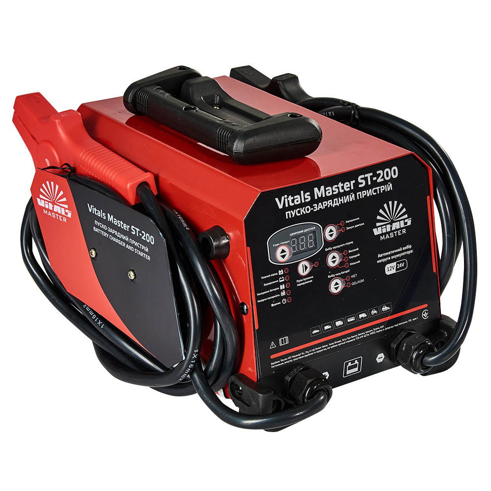 Пуско-зарядний пристрій Vitals Master ST-200 призначений для заряджання свинцево-кислотних акумуляторних батарей 12/24 В усіх типів для транспортних засобів, іншого промислового й побутового обладнання, а також запуску двигунів транспорту з розрядженими акумуляторами. Джерелом електроживлення виробу слугує однофазна мережа змінного струму напругою 230 В та частотою 50 Гц.