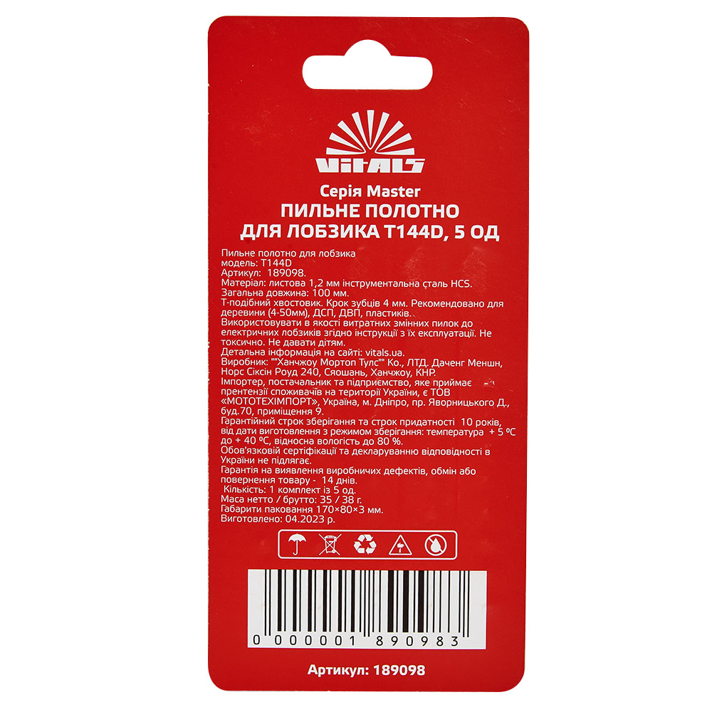 Застосування: Пиляльне полотно Vitals Master T144D є ідеальним для використання при різанні деревини, фанери, МДФ, пластика та інших матеріалів середньої твердості. Воно стане в нагоді при виконанні ремонтних, будівельних та виробничих робіт, а також під час створення меблів та інших конструкцій.