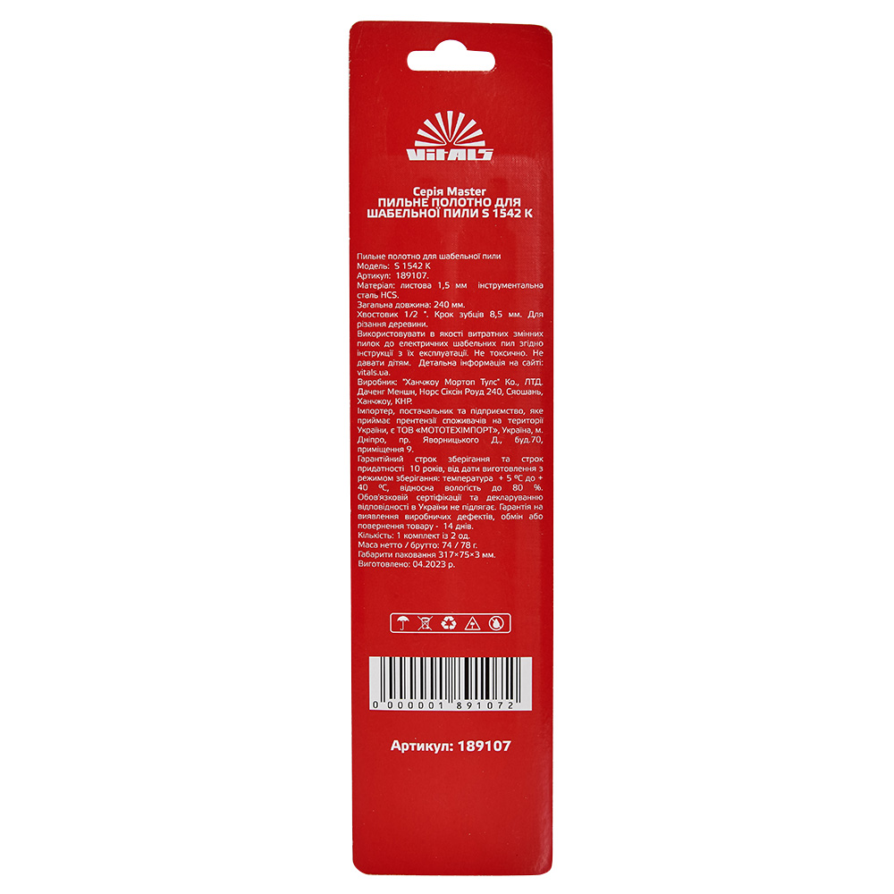 Пиляльне полотно для шабельної пили Vitals Master S 1542 K 2 од. — це високоякісні пиляльні полотна, розроблені для використання з шабельними пилами. Полотна відрізняються міцною конструкцією та високою ефективністю при різанні різноманітних матеріалів, таких як дерево, пластик, тонкі метали та інші м’які матеріали.