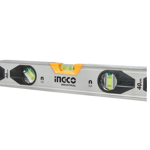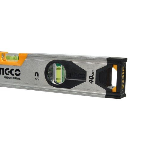 Будівельний алюмінієвий рівень 40 см INGCO INDUSTRIAL — це інструмент для точного вимірювання горизонтальних і вертикальних відхилень. Оснащений трьома капсулами для високої точності та двома потужними магнітами, він забезпечує зручність при роботі на металевих поверхнях.