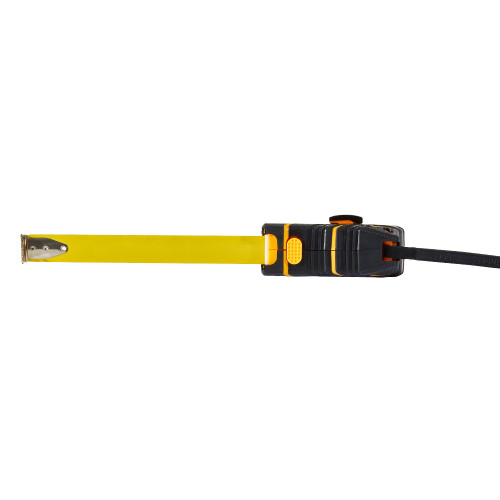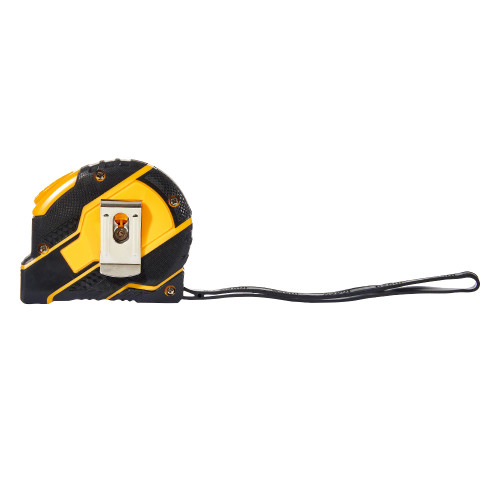 Корпус рулетки виготовлений із міцного пластику з прогумованими вставками, що забезпечує надійний захист від ударів та комфортне утримання. Чітке контрастне маркування на металевій стрічці дозволяє легко зчитувати значення, а зручний механізм змотування забезпечує плавне та безпечне втягування полотна.
