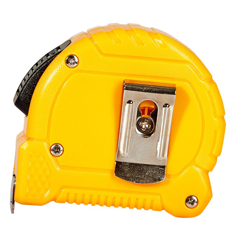 Корпус рулетки виконаний із високоміцного пластику, що гарантує надійний захист від ударів і механічних пошкоджень. Ергономічна форма забезпечує зручне захоплення, а гумові вставки на корпусі запобігають ковзанню в руках. Вбудований гачок на кінці стрічки дозволяє легко фіксувати її на краях матеріалів, забезпечуючи максимальну зручність під час вимірювань.