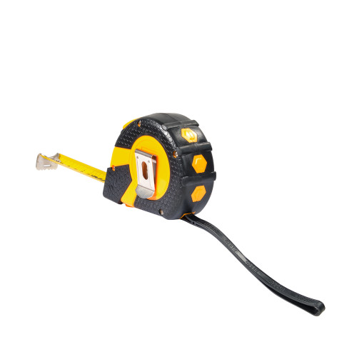 Функція автостопу автоматично фіксує стрічку при витягуванні, що робить процес вимірювання швидшим і зручнішим, дозволяючи працювати без зайвих рухів. Міцний ударостійкий корпус із прогумованими вставками гарантує довговічність та захист від пошкоджень. Чітке контрастне маркування на металевій стрічці забезпечує зручне зчитування значень, а плавний механізм змотування дозволяє уникнути ривків і надмірного зношування полотна.