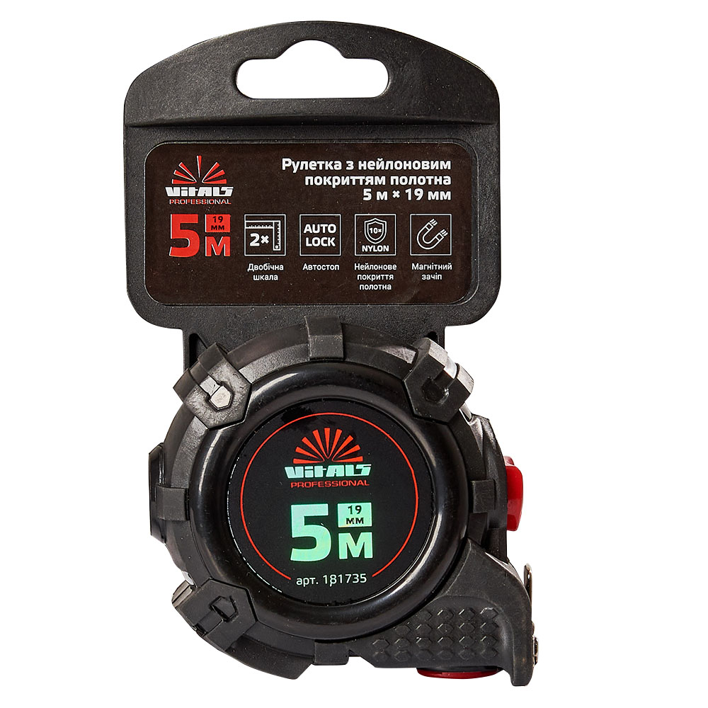 Особливості рулетки прогумованої з нейлоновим покриттям полотна 5 м × 19 мм автостоп Vitals Professional: