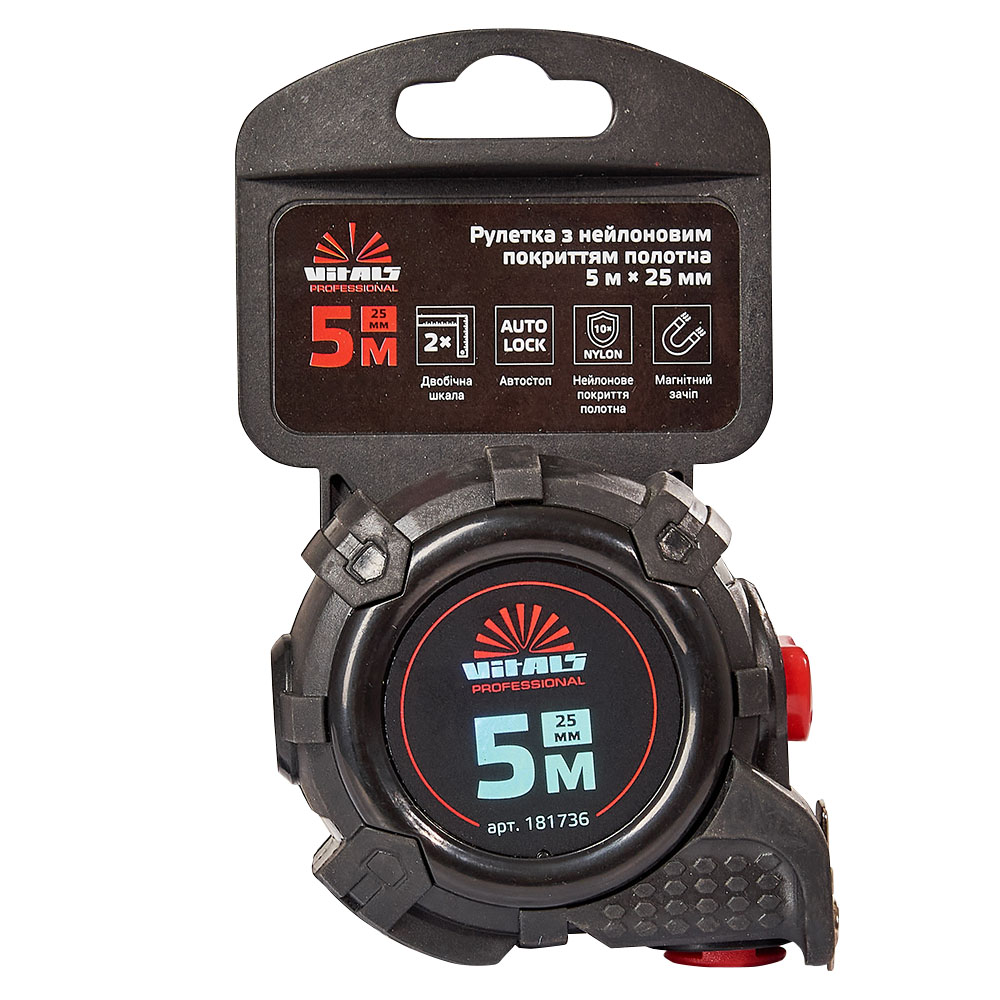 **Рулетка гумова з нейлоновим покриттям полотна 5 м × 25 мм автостоп Vitals Professional** - це надійний інструмент для вимірювання довжини під час будівельних та ремонтних робіт. Основні характеристики цієї рулетки: