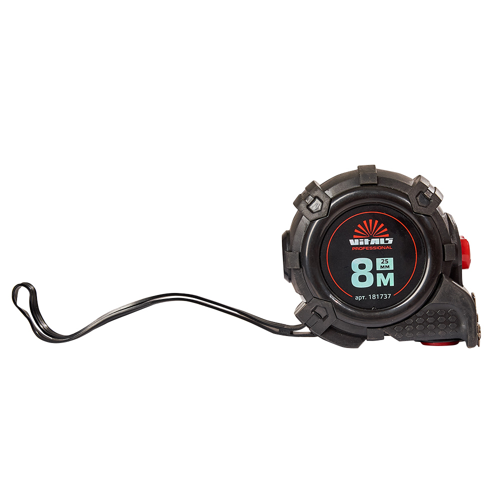 **Рулетка гумова з нейлоновим покриттям полотна 8 м × 25 мм автостоп Vitals Professional** - це інструмент, призначений для точного вимірювання довжини під час будівельних та ремонтних робіт. Основні характеристики цієї рулетки: