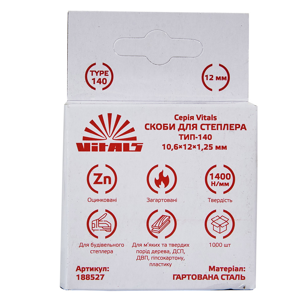 Скоби для степлера типу-140 розміром 12 × 1,2 мм у наборі на 1000 штук від Vitals призначені для використання з будівельними степлерами та застосовуються для кріплення різних матеріалів до поверхонь з м'яких і твердих порід дерева, ДВП, ДСП, пластику, гіпсокартону та інших матеріалів.