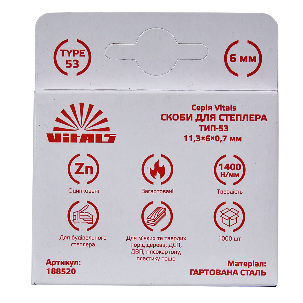 Скоби для степлера типу-53 6 × 0,7 мм 1000 штук від Vitals призначені для використання з будівельними степлерами і призначені для надійного кріплення різних матеріалів до поверхонь з м'яких і твердих порід дерева, ДВП, ДСП, пластику, гіпсокартону та інших матеріалів.
