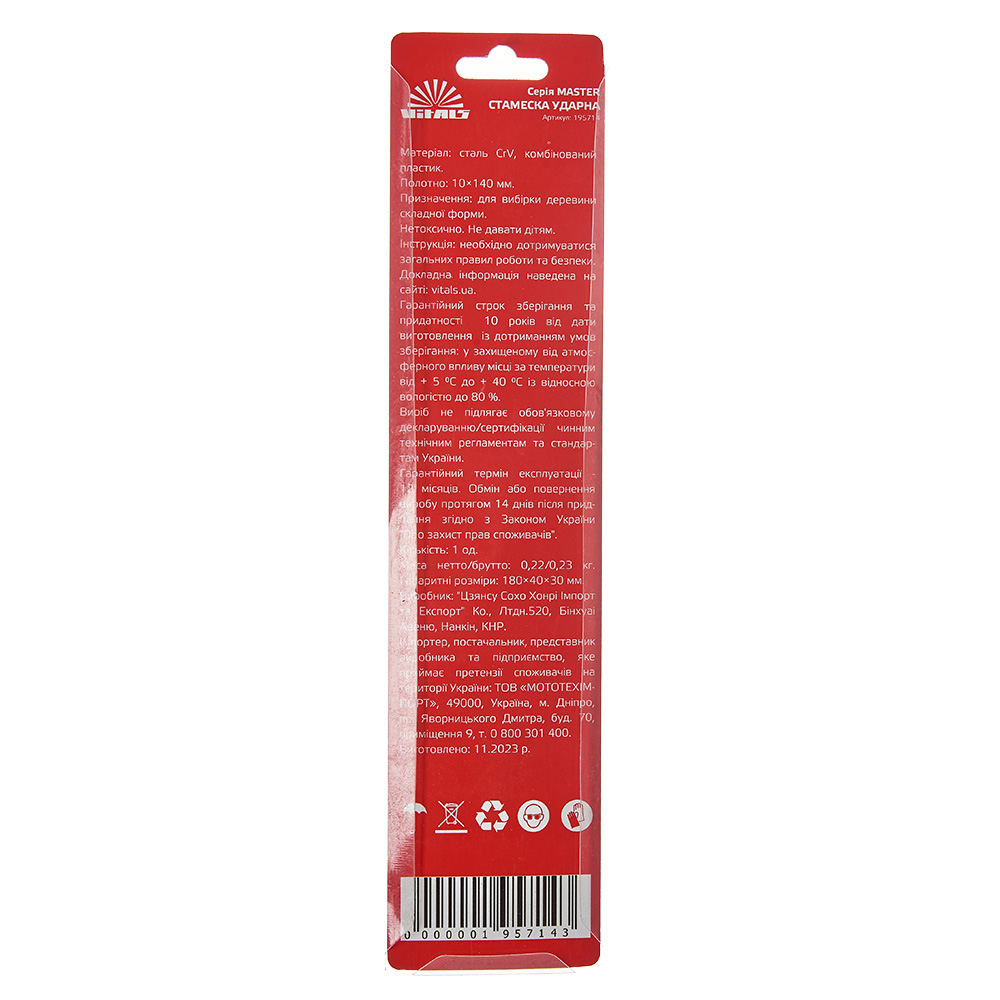 Стамеска 10×140 мм Vitals Master — це ідеальний вибір для будь-якого майстра, який потребує інструменту для високоточних і надійних робіт з деревом. Вона стане незамінною частиною вашого інструменту, забезпечуючи високий рівень ефективності і комфорт при виконанні складних завдань.