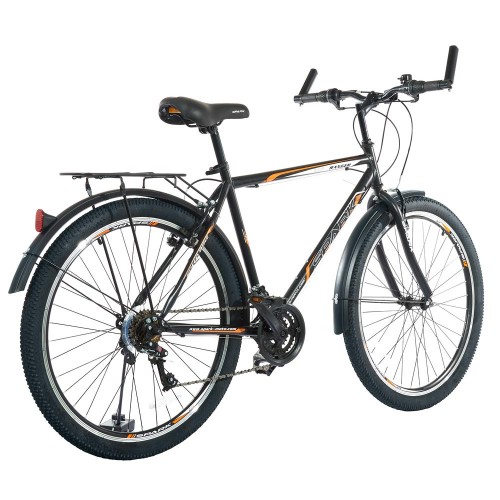 Для надійного гальмування на обидва колеса встановлені обідні гальма, які є простими в обслуговуванні і мають низьку вагу. Широке сідло і металеві крила забезпечують комфортну посадку та захист від бризок і бруду, а захисні ріжки на кермі забезпечують додатковий комфорт і безпеку.