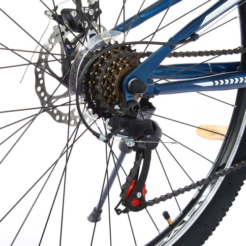 Амортизаційна вилка сприяє згладжуванню нерівностей дороги, забезпечуючи комфортну їзду навіть по найважчій місцевості. Велосипед оснащений 29-дюймовими колесами з алюмінієвими ободами, які забезпечують надійність та міцність. Покришки з універсальним протектором забезпечують впевнене керування та адаптацію до різних умов дороги.