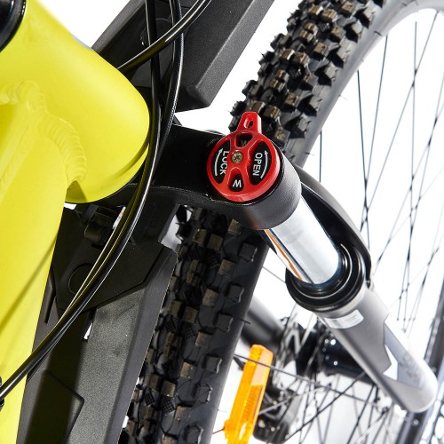 **Амортизаційна Передня Вилка:** Повітряна амортизаційна вилка з ходом 140 мм забезпечує комфортне керування і поглинає вібрації. Функції Preload та LockOut дозволяють легко налаштовувати амортизацію під свої потреби.