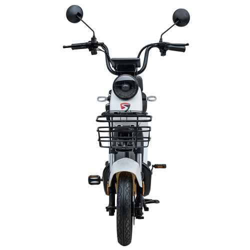 Модель оснащена LED-фарами, габаритним ліхтарем зі стоп-сигналом, поворотними індикаторами та дзеркалами заднього виду для максимальної безпеки. Передній металевий кошик витримує до 10 кг навантаження та має антикорозійне покриття. Сигналізація з дистанційним керуванням підвищує захист транспорту. Також передбачені круїз-контроль, заднє сидіння, підніжка та велосипедні педалі.