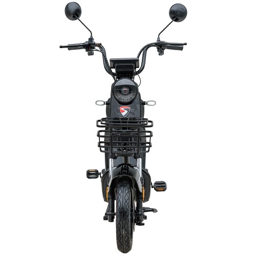 Електровелосипед продуманий до деталей: передній металевий кошик дозволяє перевозити особисті речі або покупки (до 10 кг), дзеркала заднього виду покращують огляд, а поворотні сигнали роблять вас помітними в транспортному потоці. LED-фара ефективно освітлює дорогу в темний час доби, а задній ліхтар виконує функцію стоп-сигналу. Сигналізація з дистанційним керуванням підвищує рівень безпеки.
