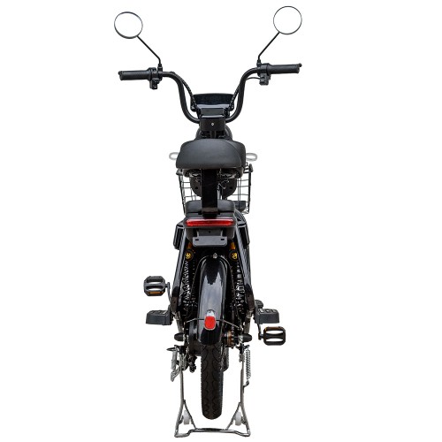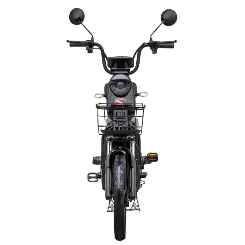 Передня гідравлічна вилка ефективно поглинає нерівності дороги, ями, бруківку чи стежки в парку, а задня амортизація додає м’якість ходу. Барабанні гальма на передньому і задньому колесі забезпечують надійне гальмування на будь-якому покритті, навіть мокрому. Металева передня корзина з антикорозійним покриттям витримує повсякденні навантаження і дозволяє зручно перевозити покупки або дрібні речі, а сигналізація з пультом і сиреною підвищує безпеку під час паркування.