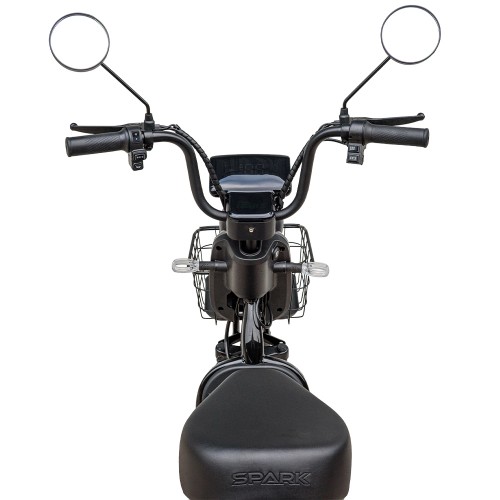 Зручність і безпеку забезпечують дзеркала заднього виду на регульованих кріпленнях і поворотні сигнали, а цифрова панель на кермі відображає швидкість, заряд батареї, режим руху, пробіг та індикатори поворотів і дальнього світла. Колеса 20×2,5 з універсальними шинами забезпечують гарне зчеплення на асфальті, гравії та траві, а міцна сталева рама витримує навантаження до 150 кг. SPARK RIDER — це поєднання надійності, стилю та практичності, готовий до будь-яких поїздок, а гарантія 1 рік на мотор і батарею забезпечує спокій і впевненість користувача.