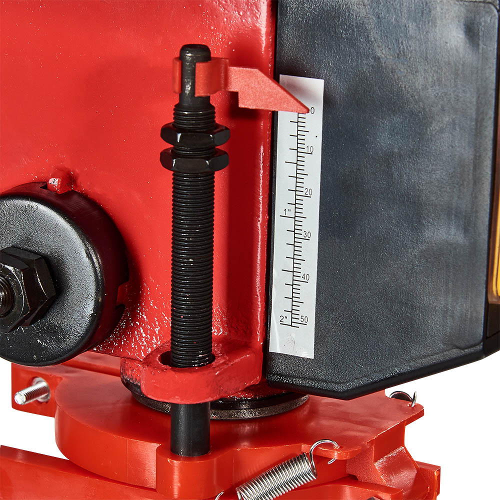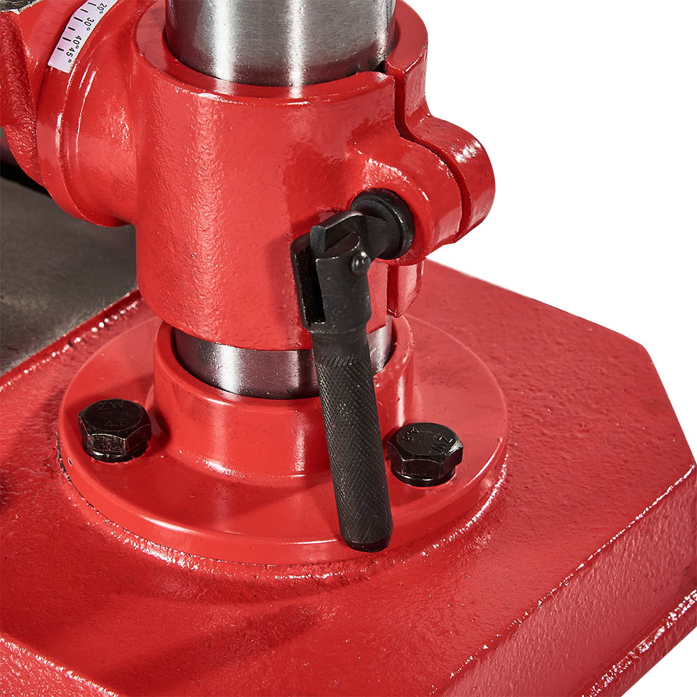 Також варто відзначити наявність кнопки аварійної зупинки, яка дозволяє негайно припинити роботу в разі виникнення надзвичайних ситуацій. Верстат має 5 швидкостей, що дозволяє регулювати швидкість обертання шпинделя в залежності від умов свердління та типу матеріалу.