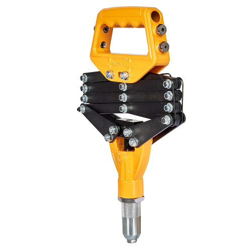 Інструмент виготовлений з високоякісної сталі з алюмінієвими елементами, що гарантує його довговічність, зносостійкість і ефективну роботу при високих навантаженнях. Розсувний механізм забезпечує збільшене плече сили, що особливо корисно при роботі з великими заклепками або твердими матеріалами.
